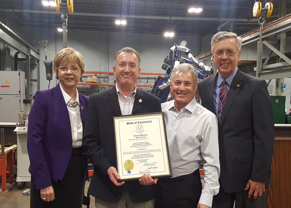 EAST GRANBY – State Representative Tami Zawistowski (R-61) recently presented a citation from the Connecticut General Assembly in recognition of the grand opening of American Cladding Technologies. In 2017, American Cladding Technologies became a subsidiary of Joining Industries and moved to a new 20,000-square foot facility at 15 International Drive in East Granby, CT. The larger facility enables the company to expand its capacity and staffing, and to continue delivering technological advances in the industry.