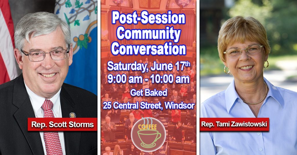 The public is invited to a Town Hall Meeting with State Representatives Scott Storms (R-60) and Tami Zawistowski (R-61), on Saturday, June 17th at Get Baked (25 Central Street, Windsor). The office hours will run from 9:00 a.m. to 10:00 a.m.