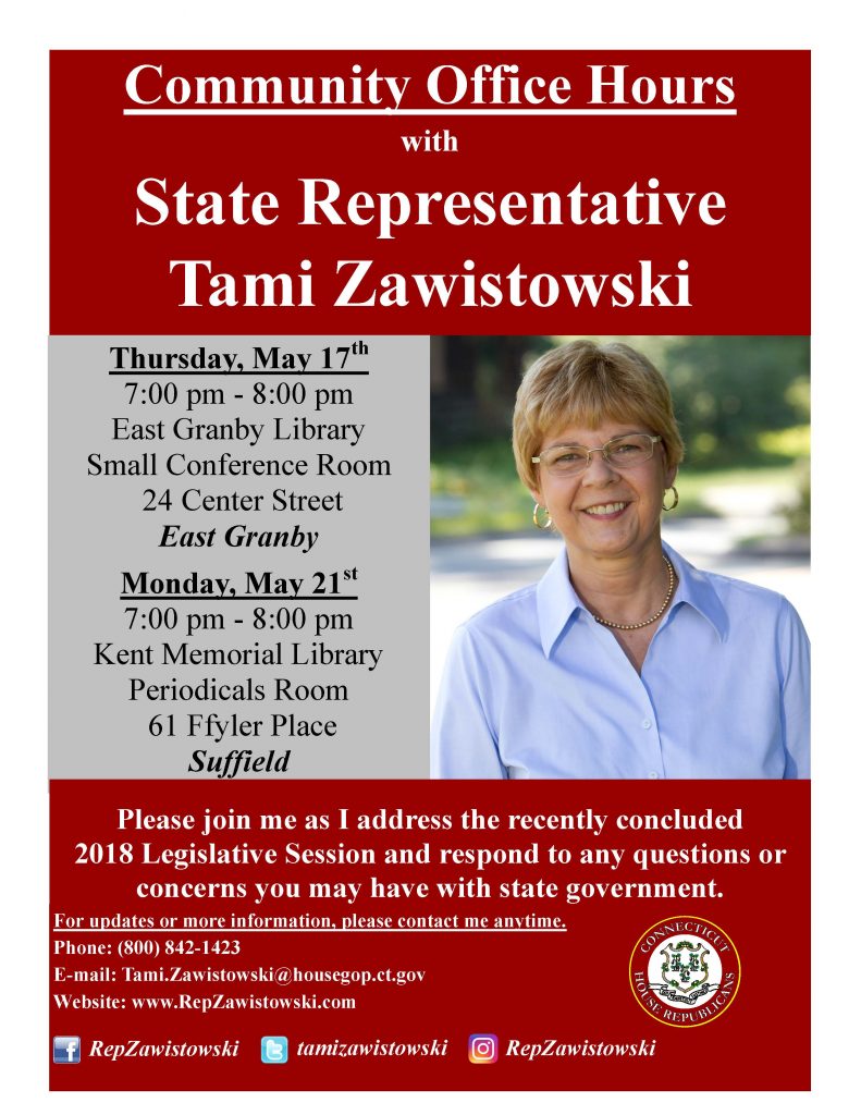 Please join me on Thursday May 17th 7pm -8:00pm at the East Granby Public Library (24 Center Street, East Granby) and Monday, May 21st 7pm – 8:00pm at Kent Memorial Library (61 Ffyler Place, Suffield) for Legislative Office Hours. As your legislator, it is very important for me to know your concerns. Please join me to discuss the budget and other legislative issues or questions you may have related to state government!