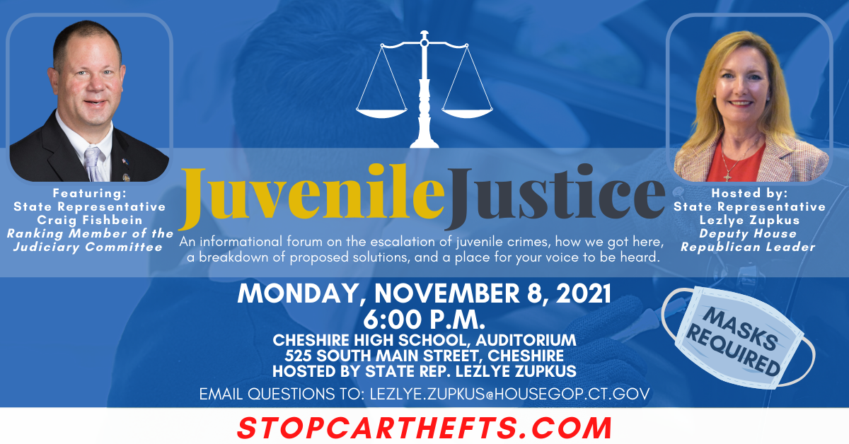 Responding to the concerns of residents statewide who are alarmed by the rise in juvenile crime, most especially the rampant increase in incidents of motor vehicle thefts, Ranking Member of the Judiciary Committee Craig Fishbein and I will be hosting a Juvenile Justice Forum on Monday, November 8 at Cheshire High School.