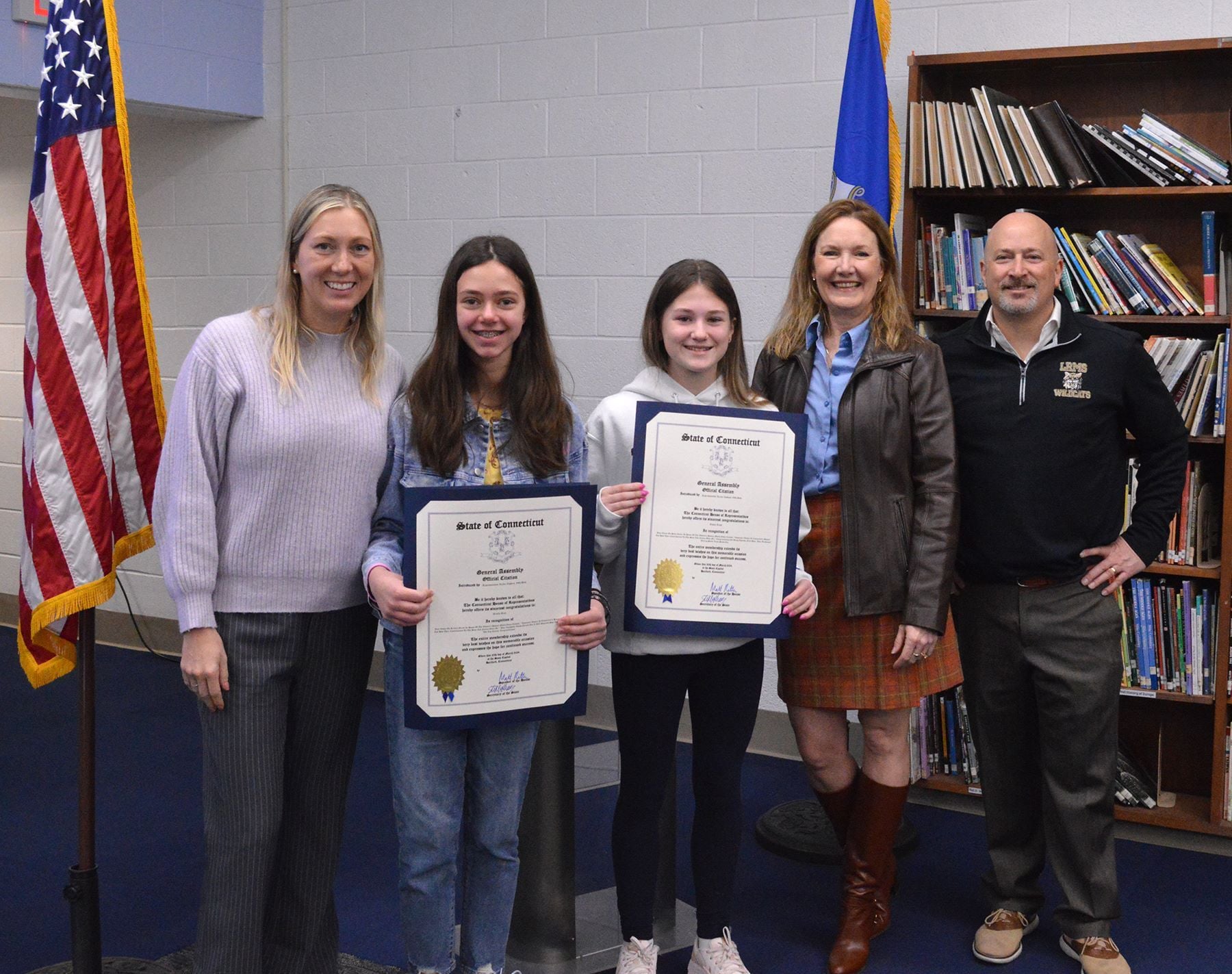 Rep. Zupkus congratulated the students, presented them with a citation from the Connecticut General Assembly, and gave a special thank you to their parents, Principal Derek Muharem and Language Arts teacher Raven Keaveney who are pictured above.