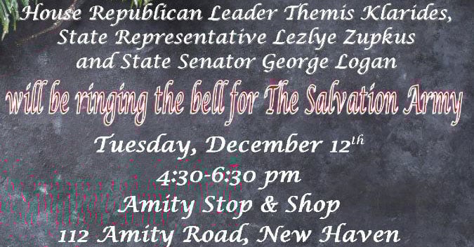 WOODBRIDGE- House Republican Leader Themis Klarides, State Rep. Lezlye Zupkus and Senator George Logan will be ringing the bell for the annual Salvation Army Red Kettle Campaign on Tuesday, December 12th from 4:30 to 6:30 p.m. at the Amity Stop & Shop, 112 Amity Rd, New Haven, CT 06515.