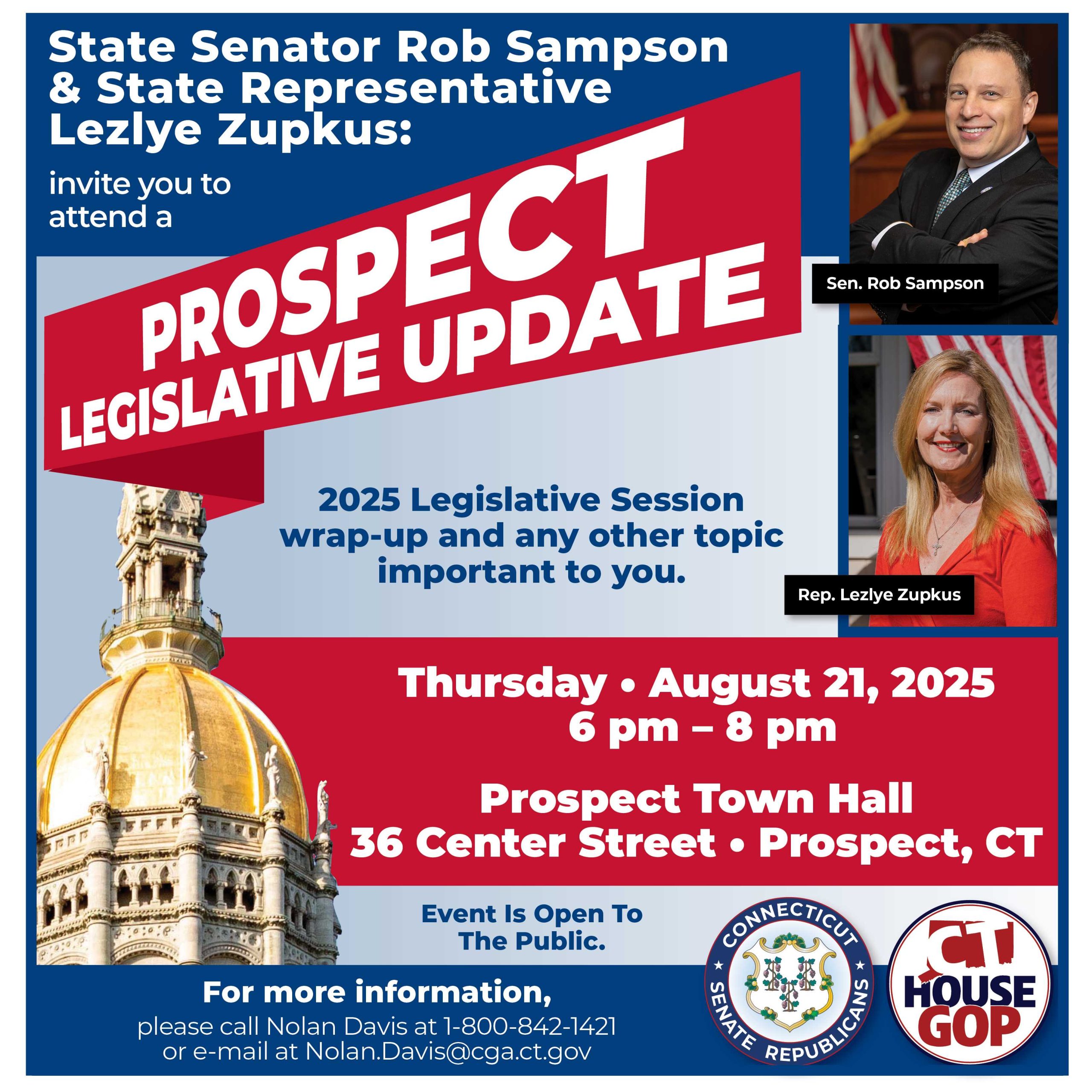 CHESHIRE/PROSPECT – State Representative Lezlye Zupkus (R-89th), and State Sen. Rob Sampson (R-16th) will hold two Legislative Updates in Prospect and Cheshire on August 20 and August 21 which is open to all residents to discuss the now-concluded 2025 legislative session.