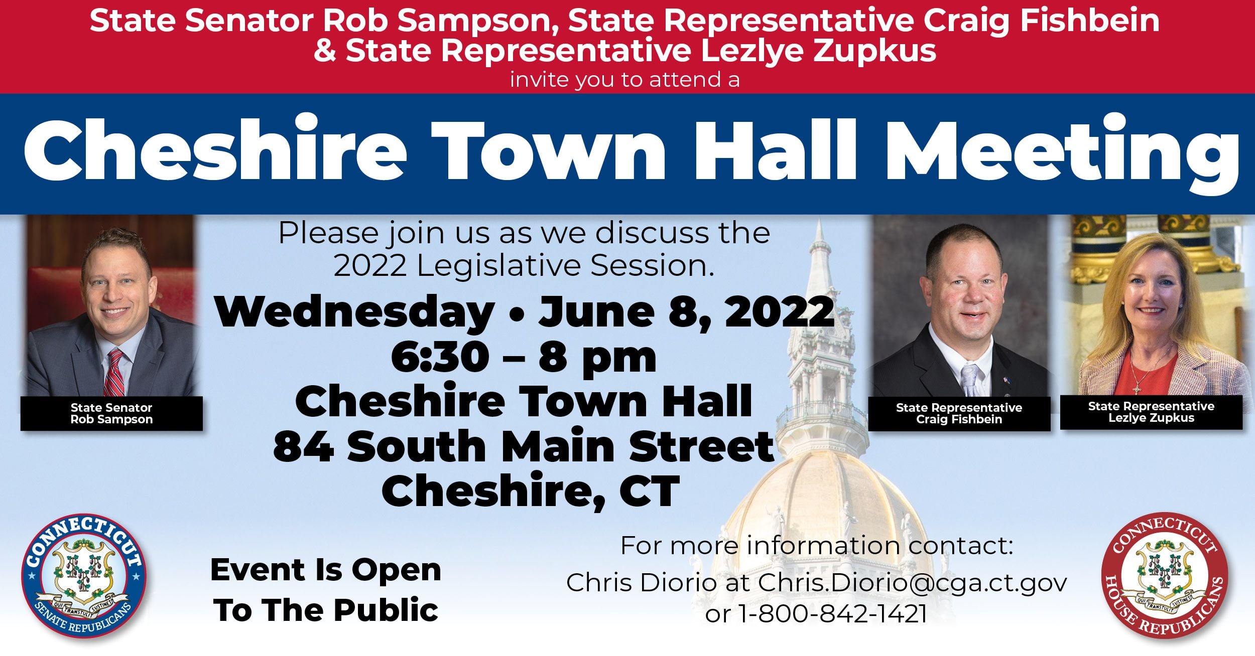 CHESHIRE – Reps. Lezlye Zupkus and Craig Fishbein, along with Sen. Rob Sampson, are inviting residents to join them next week in Cheshire for a Town Hall Meeting that will be open to all.