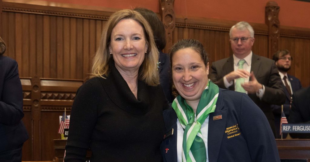 HARTFORD – State Rep. Lezlye Zupkus welcomed athletes with Special Olympics Connecticut (SOCT) on Wednesday, April 25th. Pictured – Soccer Player Angie D’Amico from Cheshire with State Rep. Lezlye Zupkus.